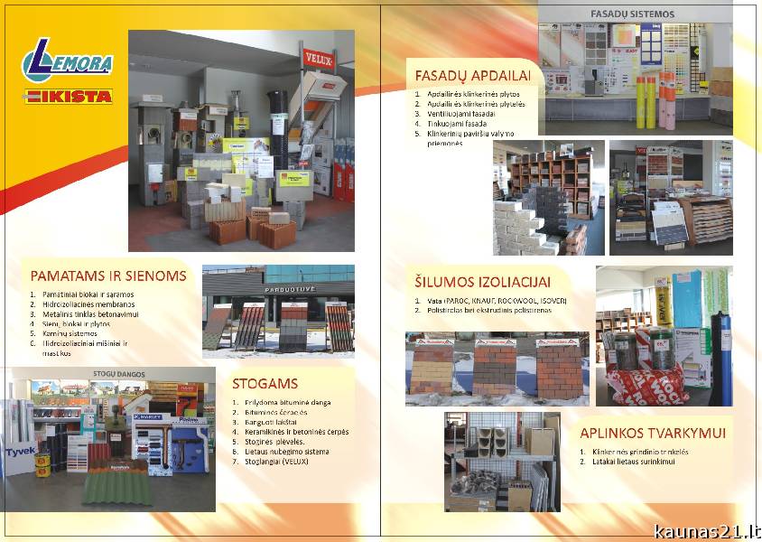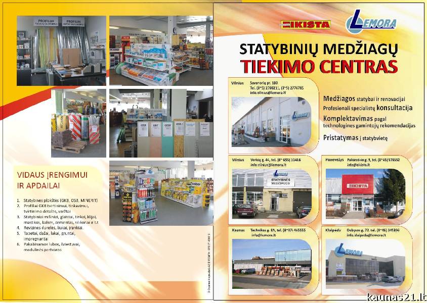 Veiklos aprašymas: UAB Lemora - viena didžiausių statybinių ir apdailos medžiagų prekybos įmonių Lietuvoje, sėkmingai dirbanti jau nuo 1993 m. Atstovaujame daugumą garsiausių gamintojų, todėl galime pasiūlyti platų prekių asortimentą, galimybę susikomplektuoti norimą krepšelį bei patrauklias gaminių kainas. Pagrindiniai mūsų klientai - statybinės organizacijos, statybinių medžiagų parduotuvės ir privatūs asmenys, statantys ar remontuojantys individualius namus. Šalia prekybos taip pat vykdome ir kitą veiklą - projektuojame, parduodame bei montuojame įvairių tipų pakabinamas lubas, mobilias pertvaras ir pakeliamas grindis. Mūsų prekybos salonai yra Vilniuje, Kaune, Klaipėdoje, Šiauliuose bei Panevėžyje, taip pat užsakymus priimame ir internetu!! Esant poreikiui, prekes pristatome tiesiai į statybvietę ar kitą nurodytą vietą Lietuvoje.